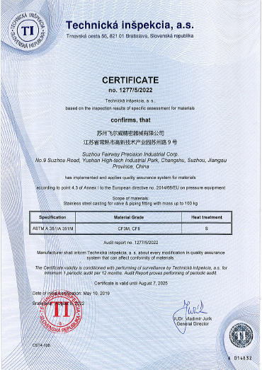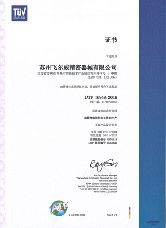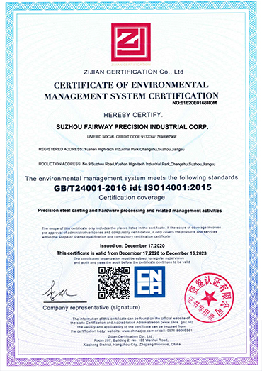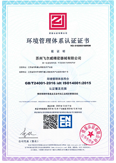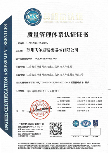 为确保长期稳定可靠的质量保证,公司拥有完整的质量体系和环境体系认证,如ISO-9001:2015、IATF-16949、PED、ISO14001。公司的每一位员工都着力于质量和过程控制,公司的质量控制手册与标准作业程序及规范,引导和控制着每一件产品从工程图纸到产品出货的每一个工序的生产过程,我们的最终目标是“零”不良。